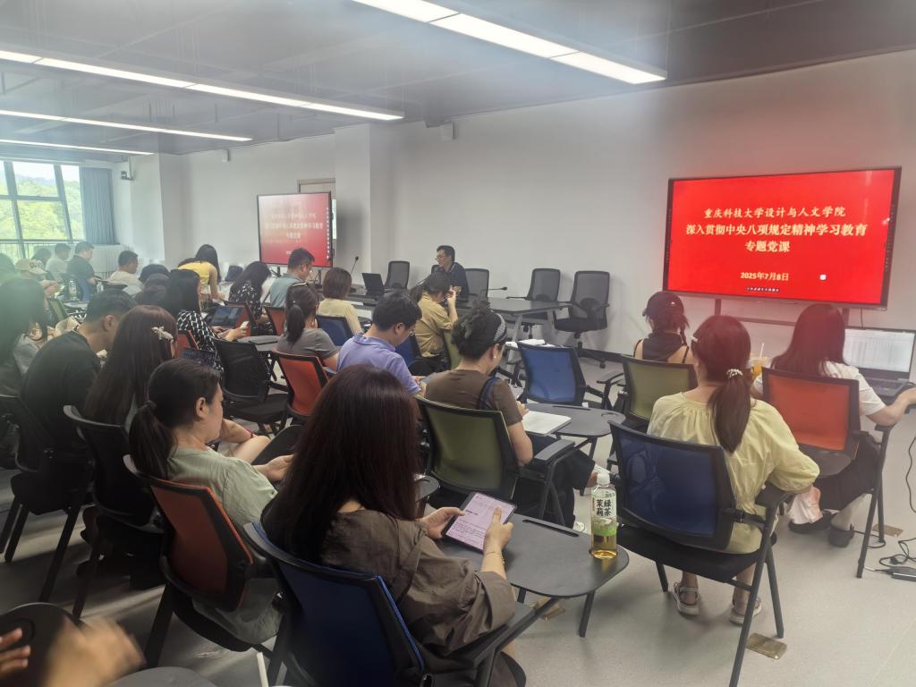 7月8日下午,设计与人文学院党总支书记何小松以“锲而不舍落实中央八项规定精神,以优良作风推动学院高质量发展”为题讲授专题党课。学校深入贯彻中央八项规定精神学习教育督导组到会指导,学院全体教职工现场聆听了党课。
