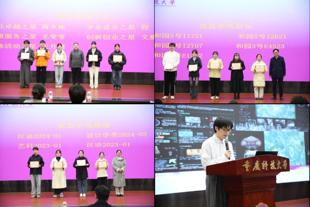 在优良学风表彰环节,副院长师会敏宣读了学院年度优良学风建设先进集体与个人的表彰决定,与会领导为获奖学生代表颁发荣誉证书。随后,获奖学生代表蒋夕彬、程波先后分享学习经验。“学业卓越之星”获得者蒋夕彬结合自身多次荣获国家级竞赛奖项的经历,分享了“以赛促学、专业深耕”的成长路径,鼓励同学们要耐心扎根,勇敢生长,在学习中找到自我发光的主场。“学业进步之星”获得者程波回顾了从不适应大学学习到实现学业进步的蜕变过程,分享了自己带着问题去学习的具体方法,强调学习之路,唯有笃行不怠,方能行稳致远。表彰环节最后,学院党总支书记何小松在总结中回顾了学院以学风建设年为契机,构建“五位一体”育人体系,在学风建设和人才培养方面取得阶段性成效。他寄语新生以榜样为引领,筑牢专业根基,拓展时代视野,勤学善思、知行合一,在青春赛道上跑出最好成绩。
